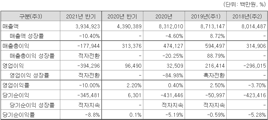 현재 적자기업이다. 2021년 반기까지 매출액 감소, 영업이익은 적자전환하는 등 그리 상황이 좋아 보이진 않는다. 다만,