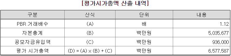 PBR 1.12배를 곱한 뒤 공모자금 유입액까지 더해 평가 시총을 산출했다.