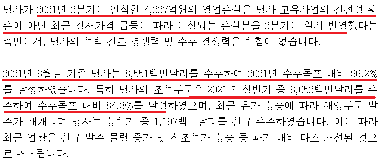 상반기 큰 폭의 영업손실은 최근 강재 가격 급등에 따른 예상 손실분을 2분기 일시 반영하였고, 연간 수주기준으로 수주 상황이 상당히 좋은 편이라 회계상으로 보이는 이익지표보다는 상황을 좋게 보고 있는 듯하다.