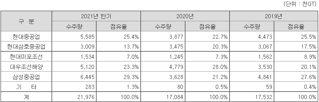 21년 6월 30일 기준으로 조선분야는 13.8조의 수주잔고를 기록하고 있다.