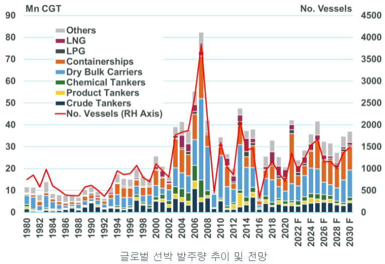글로벌 선박 발주량은 2016년 공급과잉에 따른 발주 침체로 큰 위기를 맞았으나, 그 뒤로 빠른 회복세를 보였다. 다만 2020년은 코로나 사태로 인한 조선업 불황으로 좋지 않았으나, 역시 2021년 코로나 완화 기대감과 함께 큰 폭으로 증가세를 보이고 있다.