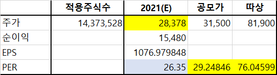 적정주가는 28,378원이라는 계산이 나온다. 할인율을 적용하지 않아도 공모가에는 미치지 못하는 금액. 따라서 공모가 고평가까지는 아니더라도, 매끄러운 공모가 산정이라고 보긴 좀.. 공모가 기준 PER은 29.24배, 따상 시 PER은 76.04배 정도이다.