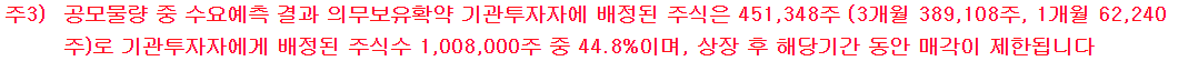 다만, 지난 브레인즈컴퍼니 청약때도 그랬듯이, 키움증권은 의무보유확약 배정 물량을 미리 밝혔다. 배정 비율은 44.8%로 수요예측 당시보다는 상당히 높은 비율이다.
