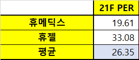 휴메딕스와 휴젤의 올해 평균 PER은 26.35이다. 이를 바탕으로 다시 적정주가를 계산해보면,