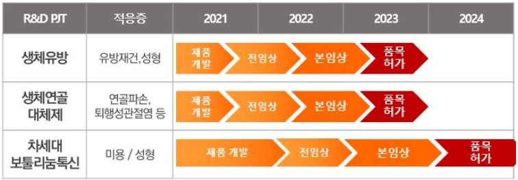 이러한 기술력을 바탕으로 현재 주요 제품인 필러나 유착방지제 외에 생체유방, 생체연골 대체제 등의 품목을 개발 중이라고 한다. 물론 2023년에 허가가 난다는 가정은 바이오플러스의 장및빛 전망일 확률이 높긴하나.. 기술력은 있어 보이니 뭐 ㅎ