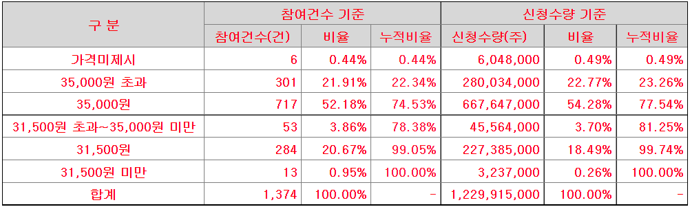 가격 분포는 굉장히 좋은 편이다. 공모가 상단인 31,500원 이상 비율이 99,74%였다. 상단초과 비율도 81.25%에 해당하는 좋은 결과이다.