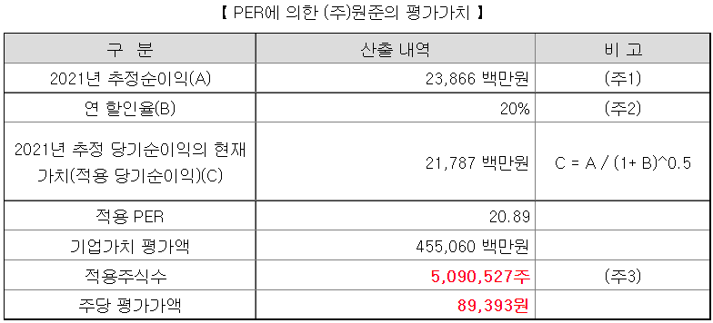2021년 추정순이익이 좀 높은 거 같긴 하다. 올해 예상 매출액으로 914억 정도를 잡았는데, 반기 매출 상황 및 작년 매출 상황과 비교했을 땐 과하게 높은 금액이다. 다만 이미 수주 후 제작 중인 프로젝트 중 하반기에 매출로 인식할 것으로 예상되는 매출이라고 하니 그러려니.. 해야 되나.. 어쨌든 이렇게 주당 평가가액을 계산했고,