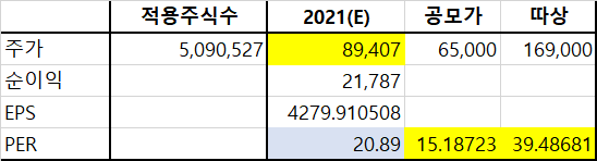 유사회사의 평균 PER은 20.89배이다. 이정도면 꽤나 준수하다. 올해 3월 공모청약을 진행했던 2차전지 공정 검사장비 업체인 엔시스의 경우 유사회사 PER을 30.9배로 계산했으며, 올해 9월 공모청약을 진행했던 EV Relay업체 와이엠텍도 유사회사로 2차전지 관련 업체들을 선정했는데 PER을 25.96배로 계산했다. 그에 비하면 굉장히 낮은 비교배수이다.