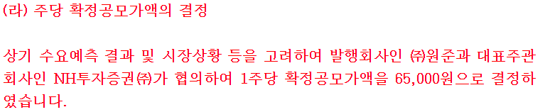 원준 수요예측 결과 최종 경쟁률 1464.1을 기록하였다. 이정도면 아주 좋다고 하긴 그렇지만, 꽤나 높은 경쟁률이다.