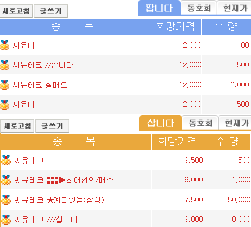 현재 씨유테크 장외가는 존재하지 않는다. 애초에 시장에 풀린 물량이 없는데 팝니다에 걸린건 뭐지..? ㅋㅋㅋ 여튼 높은 청약 경쟁률에 힘입어 매수호가는 조금 올라온 상태이다.