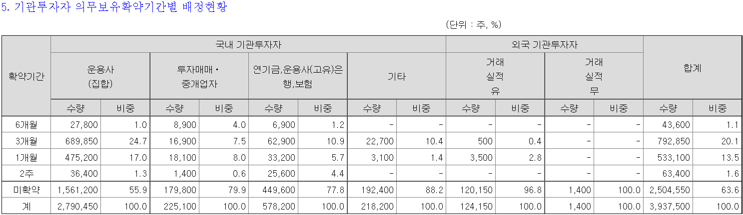 기관투자자 의무보유 배정은 기관투자자 배정물량 393만주 중 1,432,950주가 의무보유확약으로 묶이게 되었다. 미확약이 63.6%로, 배정된 의무보유확약비율은 36.4%이다.
