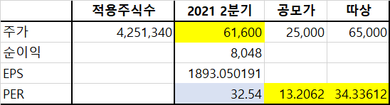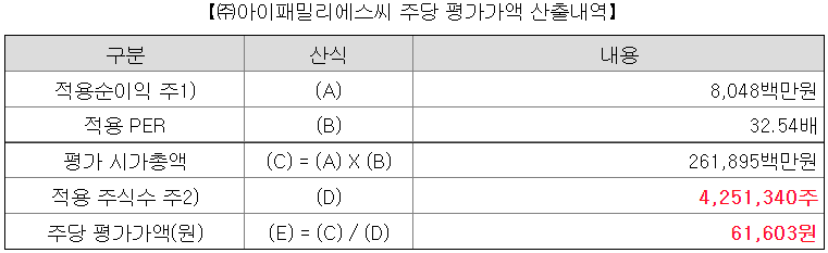 다시 돌아와서, 2021년 2분기 기준 최근 1년 순이익에서 일회성 비용을 제외한 8,048백만원을 적용순이익으로 설정하고 주당 평가가액을 산출하였다. 주당 평가가액은 61,603원이다.