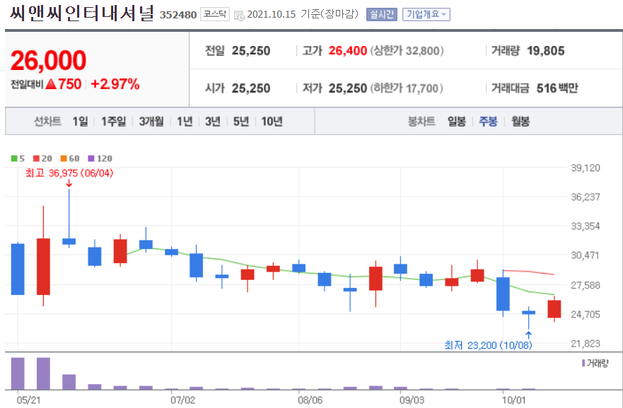 다만 공모가 47,500원이었던 씨앤씨인터내셔널의 현재 성과가 그렇게 좋지는 않다.