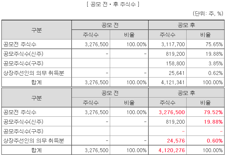 유통가능물량은 36.14%. 의무보유 확약 비율이 0%이므로, 확정된 물량이라고 볼 수 있다. 기존 주주 물량도 꽤 많은듯. 유통가능금액은 공모가 기준 372억이다.
