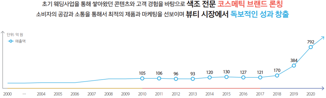 사실 최초에는 웨딩사업만 영위하는 기업이었으나, 2016년 브랜드 롬앤 런칭이후 화장품 회사로 체질을 바꿔 가는 중이라고 볼 수 있다.