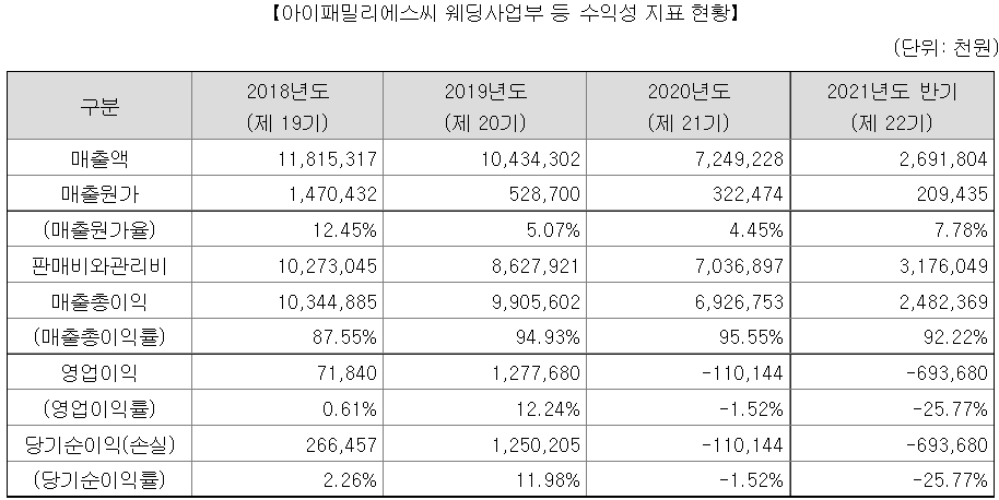 다른 이유로는 올해 상반기는 웨딩산업에게는 지옥같은 반기였기 때문이다. 코로나 사태 장기화 및 확진자 증가로 인해 웨딩사업부문은 큰 당기순손실을 기록하였다.