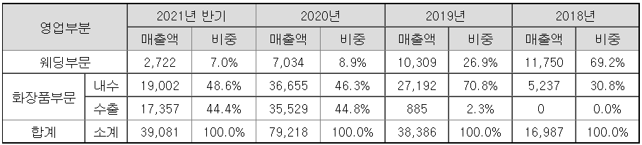 매출액은 꾸준히 상승중이다. 물론 코로나 영향도 있겠지만, 웨딩 부문 매출액은 현저히 줄어드는 추세이다. 화장품도 코로나 영향이 없는 산업군이 아니었는데, 2020년 오히려 큰폭으로 성장세를 시현하였다. 기존에 거의 없었던 수출 비중이 많이 늘어난 모습.