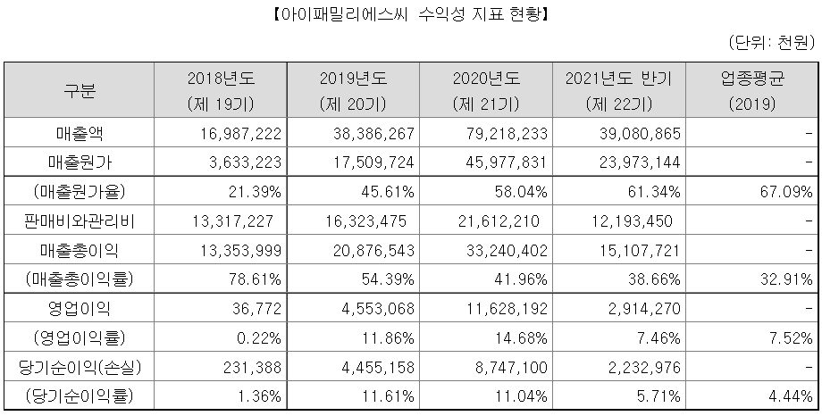 아이패밀리에스씨의 영업이익 및 당기순이익은 꾸준히 상승하는 추세이다. 다만 2021년도 반기 기준으로는 영업이익률 및 당기순이익률이 많이 떨어진 모습이다. 색조화장품 자체가 상반기보다는 하반기에 매출이 집중되는 구조라 효율적인 판매가 되지 않았을수도 있다.