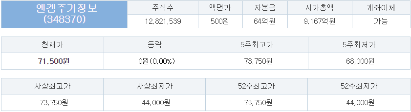 38커뮤니케이션 기준 엔켐 장외가는 71,500원이다.
