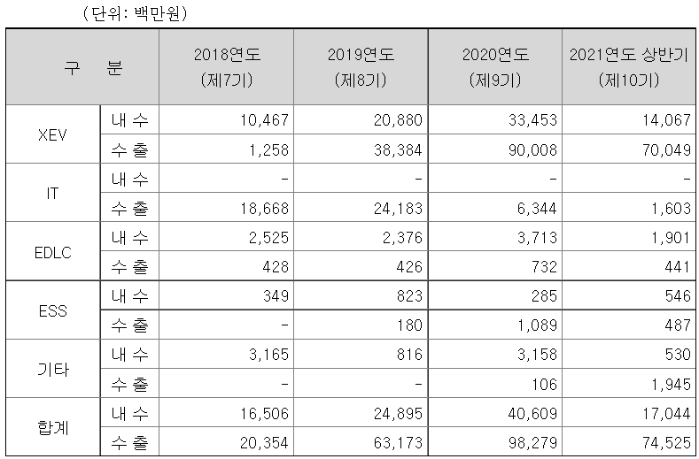 제품별 매출 현황이다. 매출의 대부분을 차지하는 XEV는 자동차용 2차전지에 들어가는 전해액이다. 다른 매출은 사실상 미미한 수준.