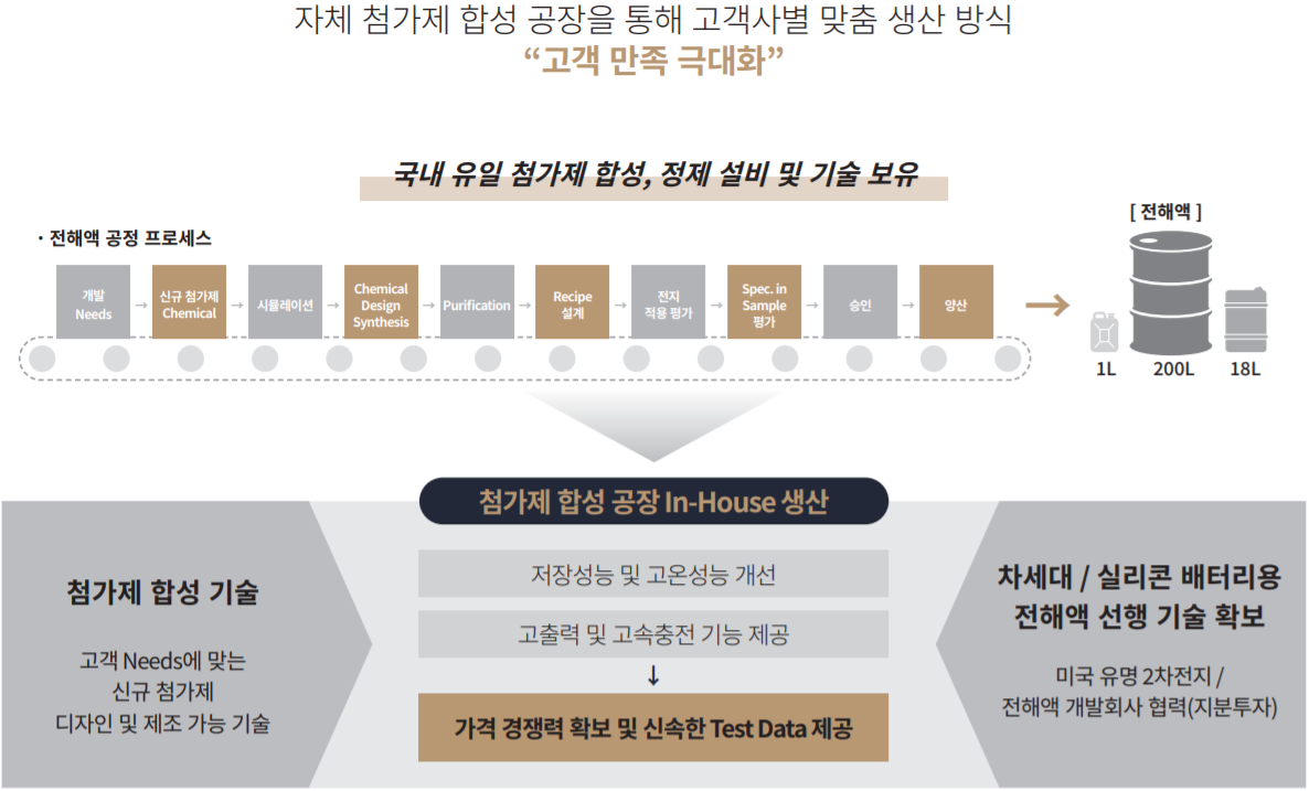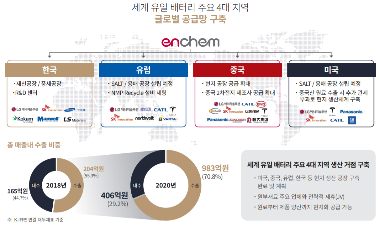 전해액은 다른 2차전지 소재와는 달리 유통기한이 존재하고, 위험물, 유독물로 분류되어 보관비가 상당히 높기 때문에, 고객사에 납품하려면 실제로 물리적인 거리가 가까운게 매우 중요하다.