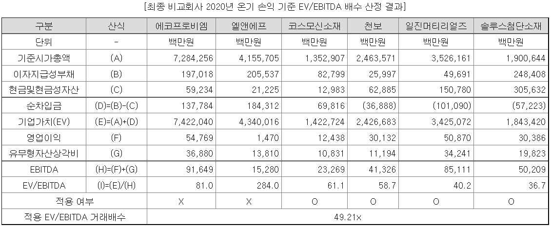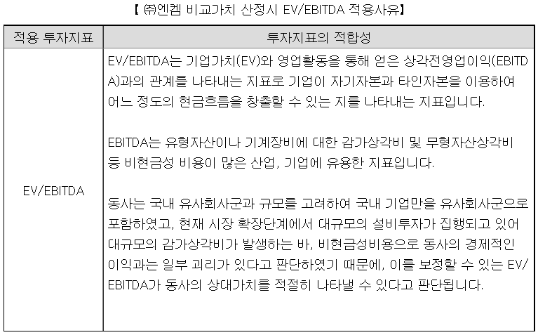 유사기업 선정 내역에 앞서, 엔켐은 비교가치 산정시 EV/EBITDA를 사용하였다.