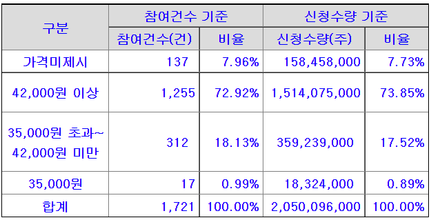 공모가 상단은 물론이고 42,000원 이상 신청 비율이 73.85%에 달한다. 가격 미제시를 포함하면 80%를 상회하는 수준.. 이긴한데..