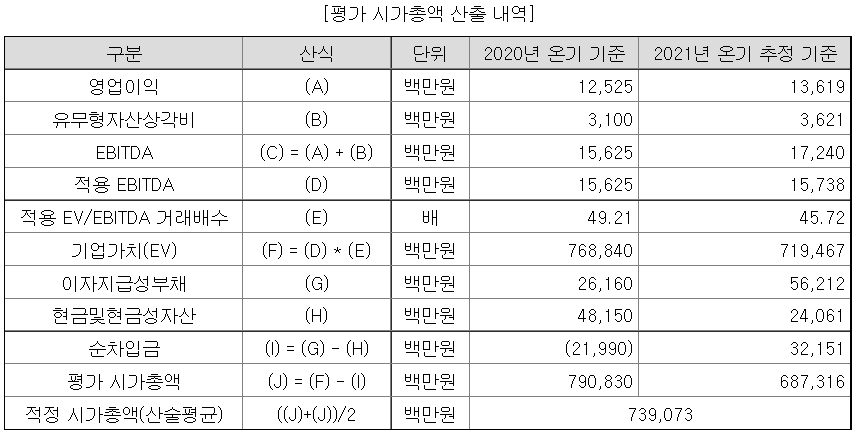 두가지 기준을 각각 적용한 뒤 적정 시가총액을 산술평균하여 산출했다.