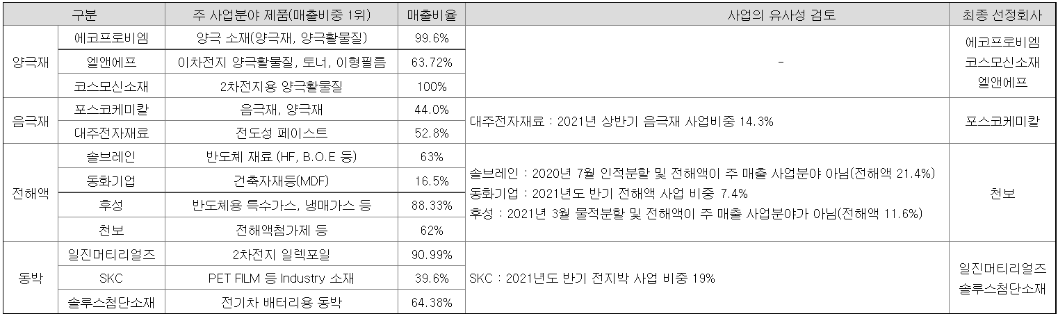 리튬이온배터리 제조 Value-Chain에 연관된 사업을 영위하는 업체들 중 매출 비율을 따져 선정하였다. 언뜻 보면 딱히 문제가 없는 것으로 보일 수 있으나..