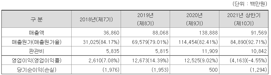 의외로 2021년 상반기 기준 적자회사이다. 매출액은 꾸준히 늘었으나 영업이익마저 적자로 돌아섰는데, 표에서도 볼 수 있지만 매출원가가 어마어마하게 늘어났다.