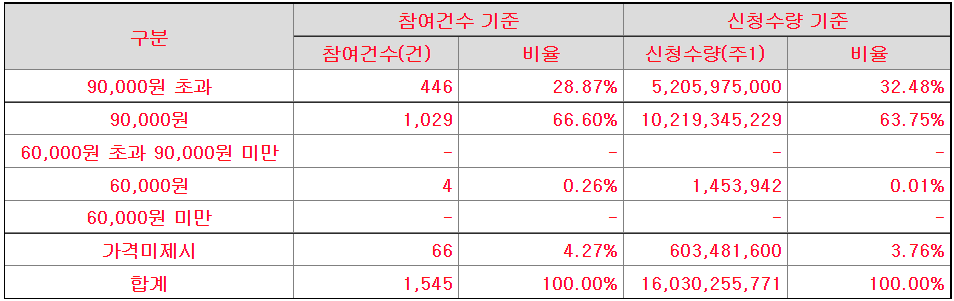 다만 가격 분포가 그렇게 좋진 않다. 90,000원 초과 32.48%, 90,000원에 63.75%가 몰렸다. 압도적이라고 보기엔 어려운 상황. 하긴 근데 압도적이었으면 분명 공모가 더 올렸을거다.