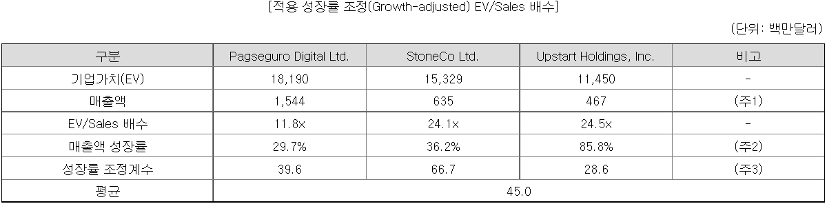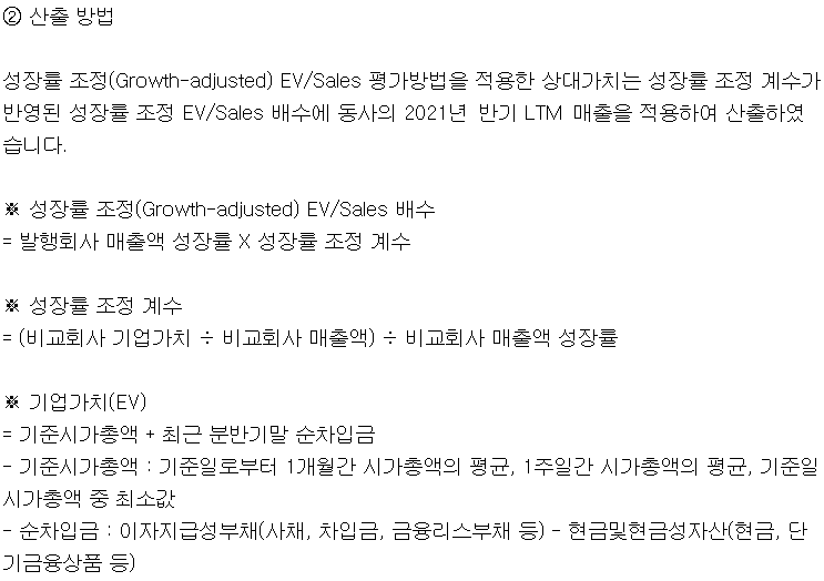 유사기업 선정에 앞서, 평가방법을 성장률 조정 EV/Sales라는 다소 생소한 방법을 사용하였다.