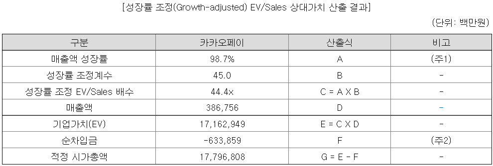 카카오페이의 매출액 성장률 98.7%에 성장률 조정계수 45를 곱해서 성장률 조정 EV/Sales 배수를 산출하였다. 이렇게 되면 상대적으로 성장률이 높은 카카오페이의 기업가치는 높아지게 된다. 산출된 적정 시가총액은 17.79조...