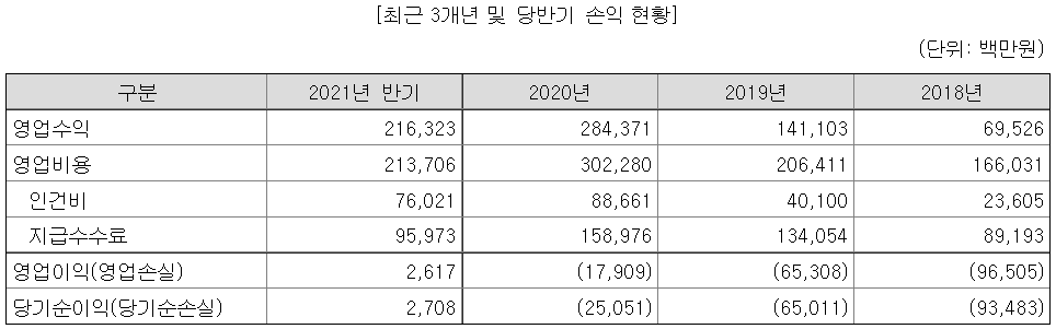 다만 최근 사업년도까지는 적자회사였다. 외형성장에 치중하다보니 막대한 영업비용 지출로 손실액이 컸으나, 2021년 반기 기준으로는 흑자전환에 성공한듯.