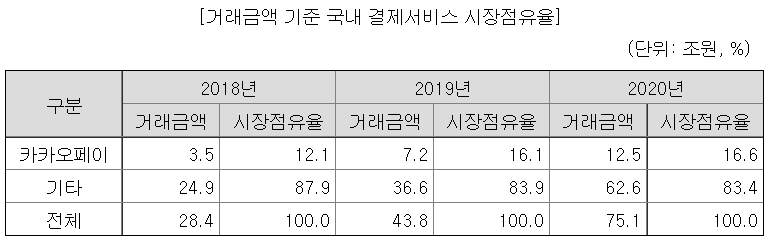 카카오톡이라는 막강한 플랫폼을 바탕으로 국내 최초로 모바일 간편결제 서비스를 실시하였다. 2020년 기준 가입자 수 3,500만, 올해 7월 기준 3,660만명으로 국민 대다수가 가입되어 있는 플랫폼이라고 할 수 있다.