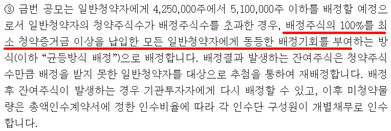 참고사항으로 이번 카카오페이 공모주 청약은 균등배정 100%로 진행된다. 비례배정이 없다.
