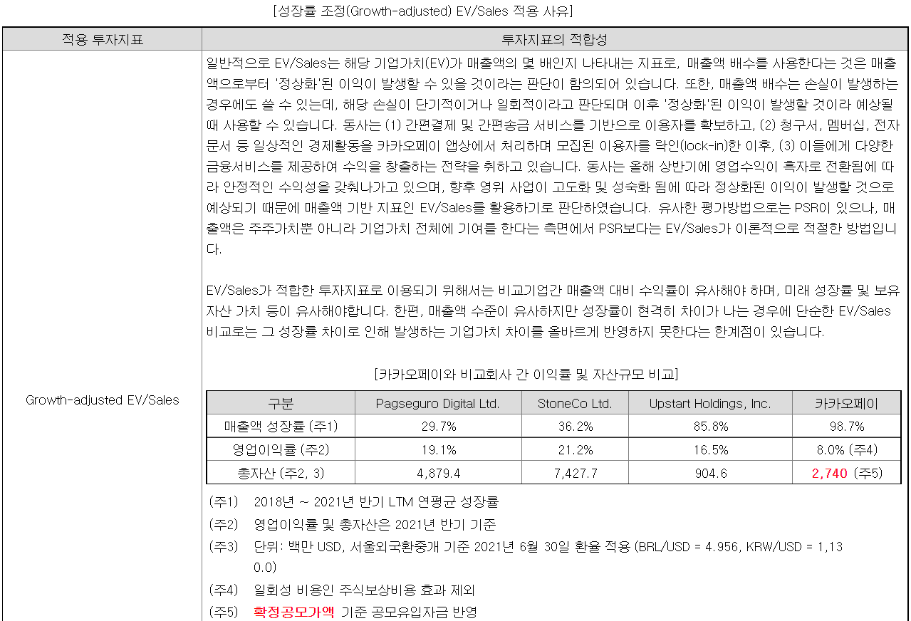 한마디로 우리는 매출액은 높은데 이익은 낮고, 성장률이 좋으니 그걸 모두 다 반영시키겠다는 전략인데, 카카오답다고 해야될지.. 사실 이러한 투자지표를 쓰지 않으면 카카오페이는 제대로 된 기업가치 산정이 힘들수도 있다.