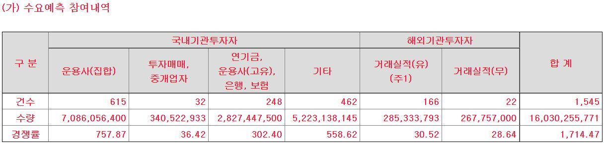 높은 기업가치에도 불구하고, 수요예측은 상당히 흥행하였다. 최종경쟁률 1714.47을 기록하였다.