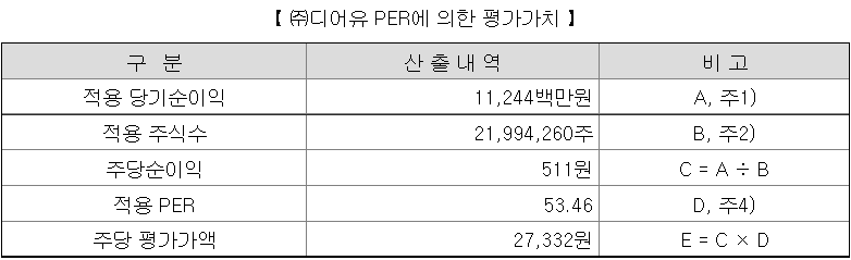 2021년 반기 순이익을 연환산하여 계산하였다. 해당 순이익은 상반기 순이익에서 회계상 이슈로 인한 평가손실(금융부채평가손실, 전환사채 조기상환 이익 등)을 제외하여 계산하였다. PER 53.46배를 적용한 주당 평가가액은 27,332원이다.