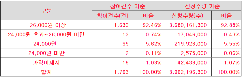 밴드 상단은 물론이고 26,000원 이상 신청 비율이 92.88%에 달한다. 가격 미제시를 포함하면 94%에 육박하는 수준.