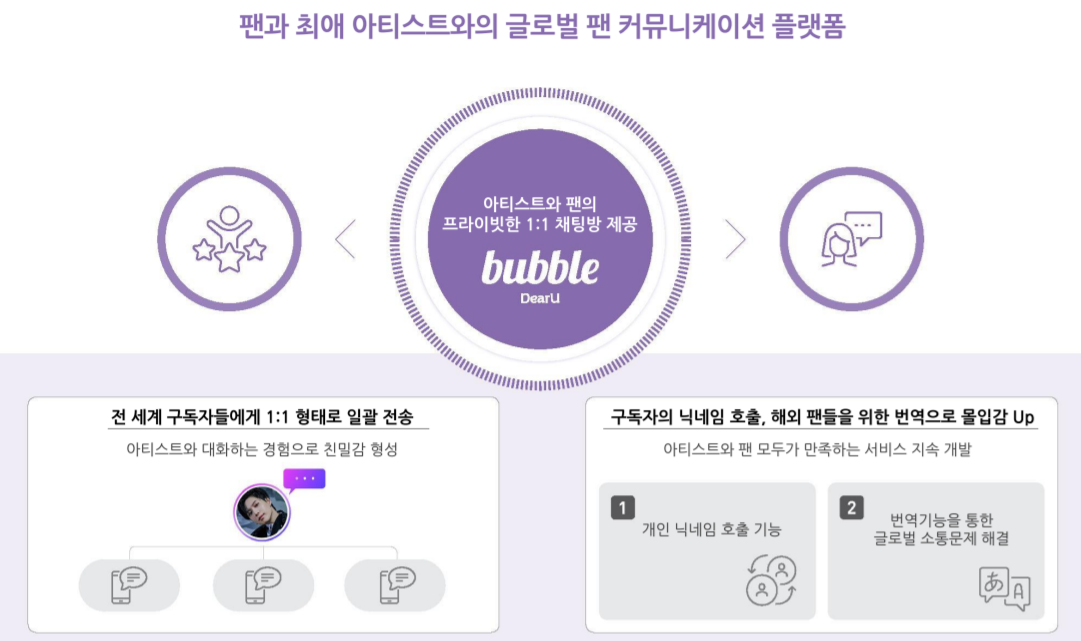 디어유는 아티스트와 1:1 형태로 대화하는 듯한 느낌을 주는 형태로 아티스트가 팬의 이름을 직접 불러줄 수도 있고, 글로벌 팬층을 겨냥한 번역기능까지 제공한다.