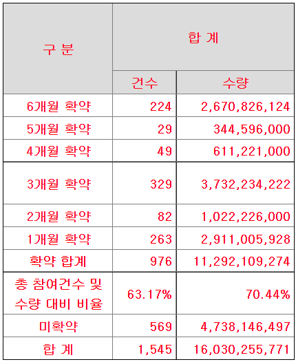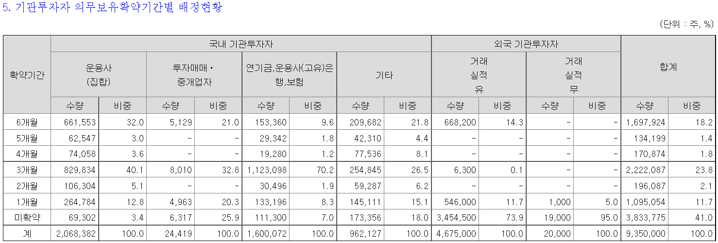 기관투자자 의무보유 배정은 기관투자자 배정물량 935만주 중 5,516,225주가 의무보유확약으로 묶이게 되었다. 미확약이 41%로, 배정된 의무보유확약비율은 59%이다.