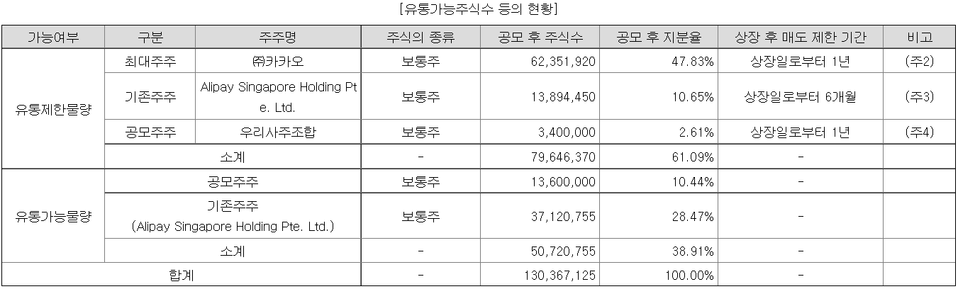 공모 당시 카카오페이의 총 발행주식 합계 130,367,125주 중 50,720,755주가 유통가능물량으로 38.91%였다.