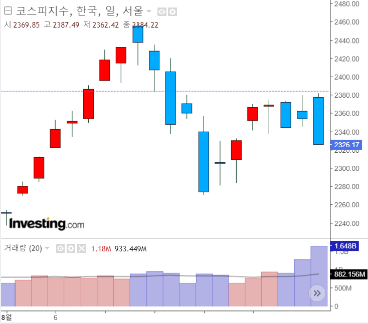 8월 코스피는 중순쯤 최고점을 찍더니, 조정이 한번 온 상태이다. 시장이 항상 오를 수만은 없다. 자연스러운 현상이다. 오히려 조정이 너무 늦게 온거 아닌가 싶다.