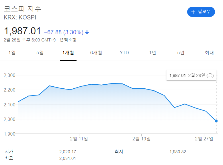2020년 2월은 상고하저로 마지막 한주는 코로나로 인해 정말 끔찍했다.
