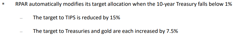 RPAR은 이미 예전에도 밝혔다시피, 이 디플레이션 우려에 따른 목표할당 기준을 10년물 채권 금리로 잡고 있다. 10년물 채권 금리가 1% 미만으로 떨어질 때 비중을 바꾸는 것인데,