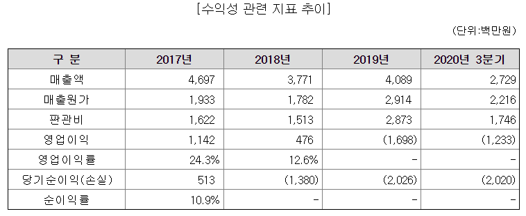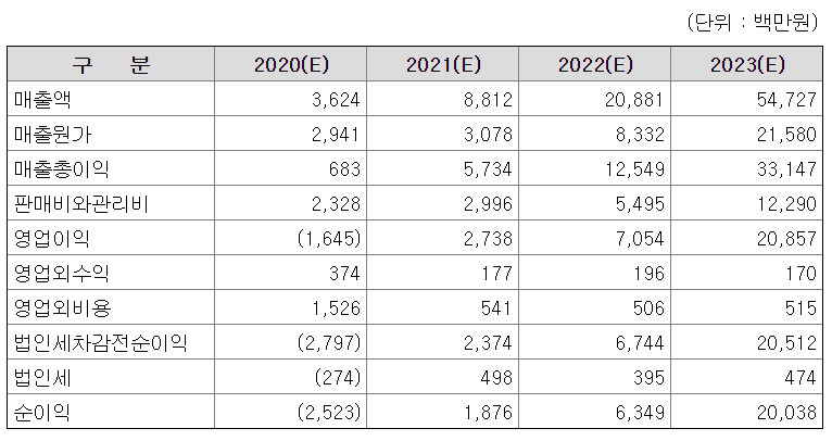 다만 현재까지는 이익실현 기업은 아니며, 앞서 말한 글로벌빅파마와의 계약이 이행되어야 실질적인 매출액 증대가 일어날 것으로 보인다. 회사 측은 이 시점을 2021년 하반기 이후로 보고 있다.