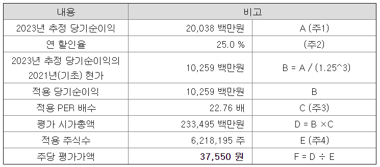 결과적으로 2023년 추정 당기순이익에 연 할인율 25%를 적용하고, 적용 PER 22.76배를 적용하여 주당 평가가액 37,550원을 산출하였다.
