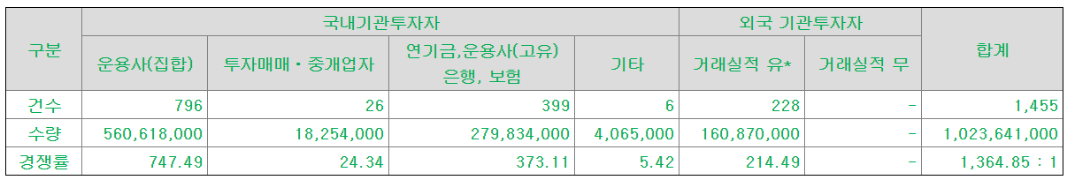 총합계 1364.85의 경쟁률을 보였다. 요즘 IPO 치고는 나름 무난한 수치로 보인다.