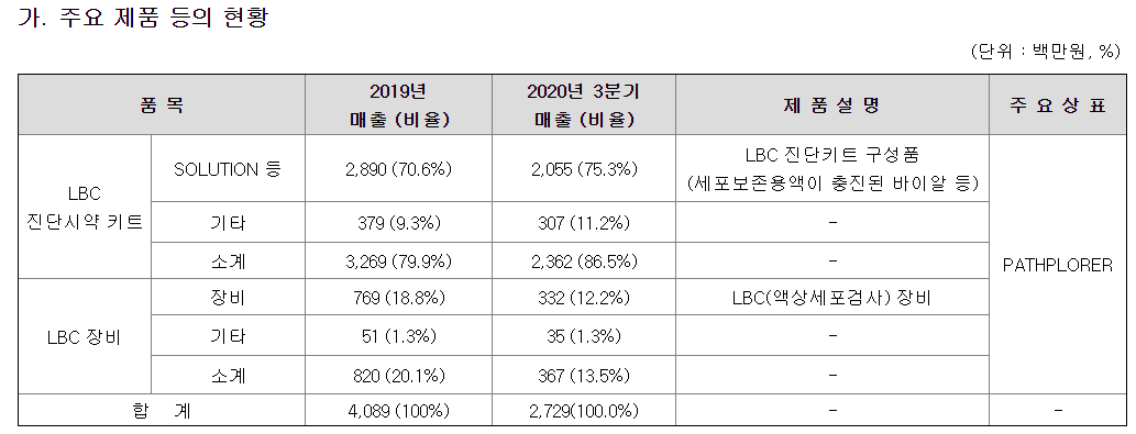 이러한 블로윙 기술을 바탕으로 전 과정을 자동화한 검사장비를 개발, 판매하고 있으며, LBC 장비를 구매하여 사용하고 있는 매출처에 대해 블로윙 기술에 최적화된 형태의 진단시약 키트를 개발, 판매함으로써 지속적인 추가 매출을 발생시키고 있다고 한다.